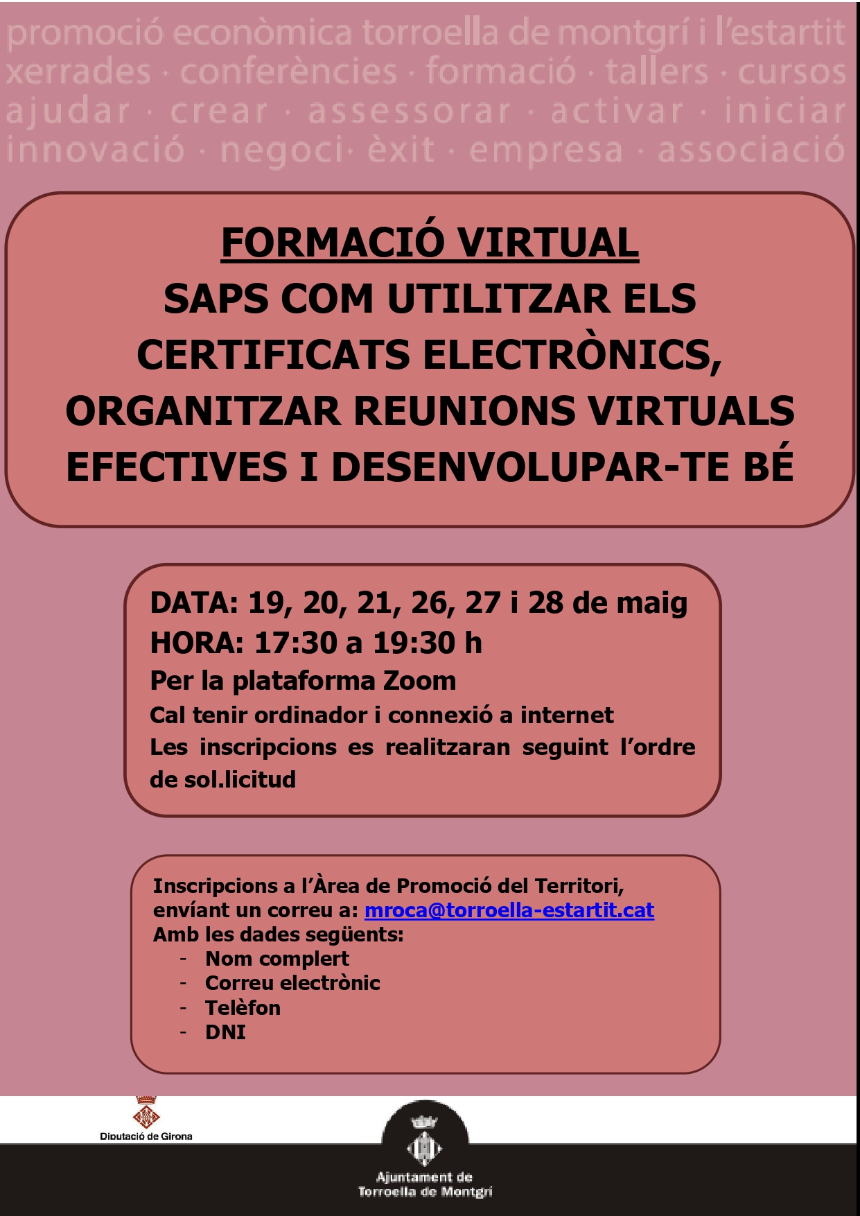 Inscripcions: mroca@torroella-estartit.cat indicant nom , correu electrònic, telèfon i DNI