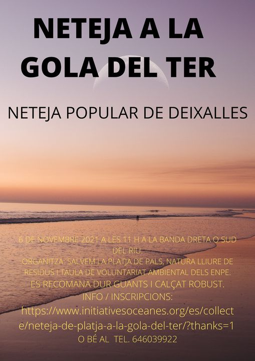 Neteja popular de deixalles a la Gola del Ter banda dreta o sud del riu durant aproximadament una hora. Es recomana dur guants i calçat robust